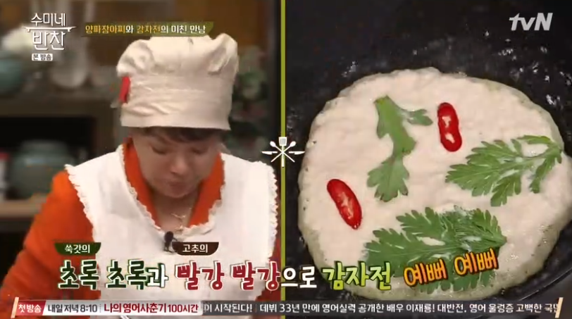 재료 : 감자 3개 / 밀가루 5큰 술 / 올리브유 / (고명으로 쓸) 쑥갓과 고추