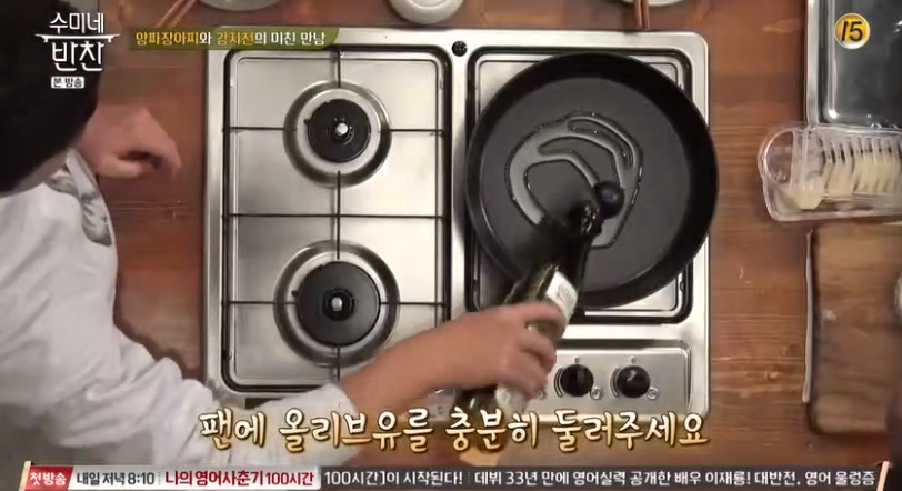 5. 감자전 만드는방법 이제 감자전을 구울 차례입니다. 팬에 올리브유를 충분히 둘러줍니다.