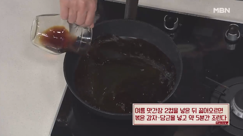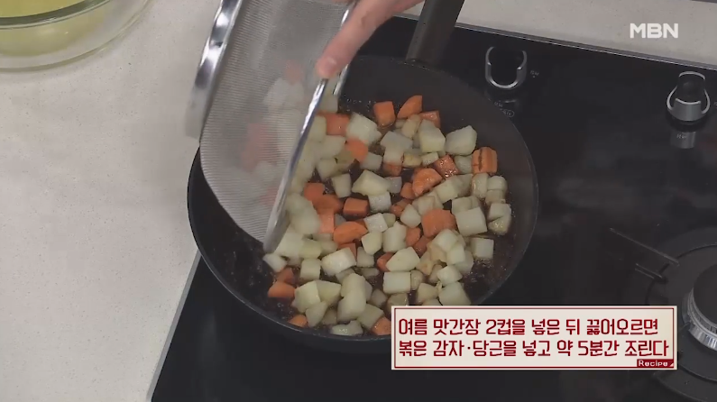 9. 여름 맛간장 2컵을 넣고 끓어오르기 시작하면 볶은 감자, 당근을 넣고 약 5분간 조리면 되는데요, 맛간장의 간을 딱 맞춰놨기 때문에 물을 더 넣을 필요는 없어요.