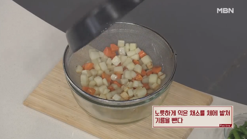 8. 노릇하게 익은 채소를 체에 밭쳐서 기름을 빼세요.