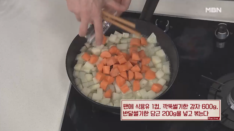 7. 팬에 식용유 1컵을 넣고 열이 오르면 깍뚝썬 감자 600g, 반달썰기한 당근 200g을 넣고 볶습니다.