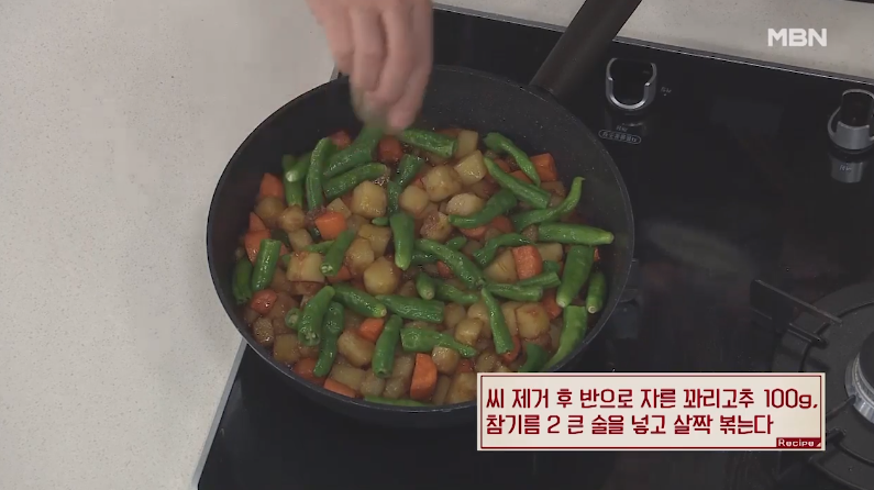 10. 씨 제거 후 반으로 자른 꽈리고추 100g, 참기름 2큰술을 넣고 살짝 볶아 주세요.
