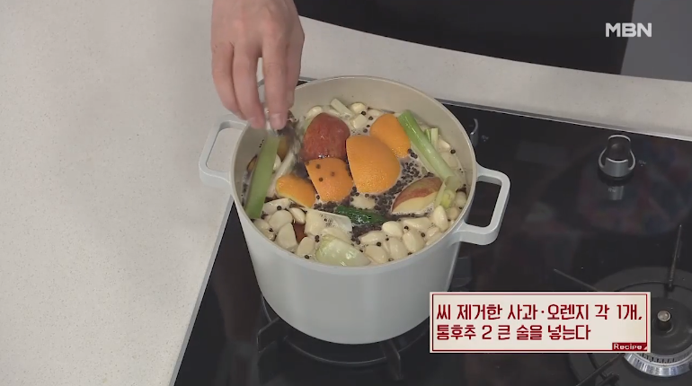2. 양파 1개, 저민생강 30g, 반으로 가른 청양고추 3개, 씨 제거한 사과, 오렌지 각 1개, 통후추 2큰술 넣으면 되는데요, 오렌지는 소금으로 껍질을 문질러 깨끗이 씻고, 껍질째 넣어주셔야 해요.