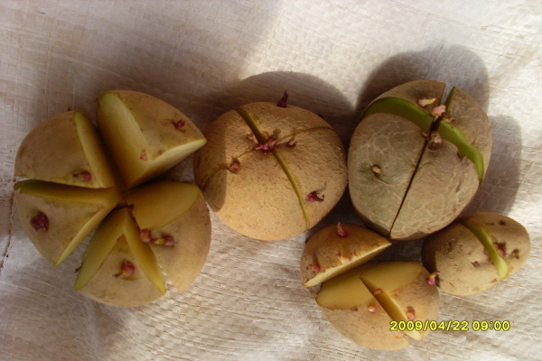 다음으로는 씨감자를 심기 전에 잘라주는 단계인데요, 씨감자를 절단하는 시기는 산광최아를 시작한 후 15~20일 정도 경과되었을 때라고 합니다. 이때 감자싹의 길이가 0.5~1㎝ 가까이 자라고 감자싹의 색이 진녹색이나 보라색으로 변합니다.