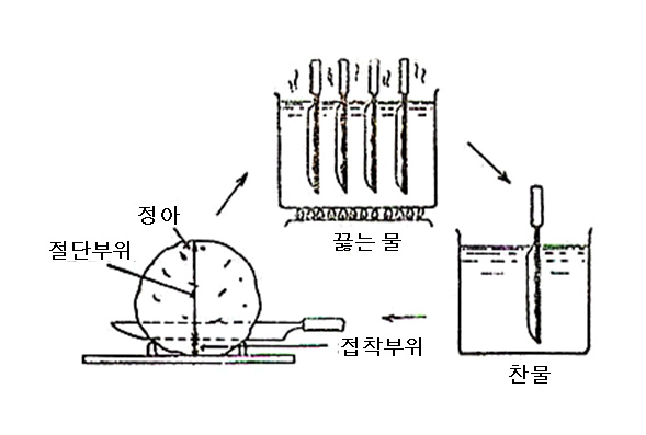 씨감자를 절단할 때 가장 중요한 것은 감자 자를 칼을 꼭 소독해야 한다는 것입니다. 끓는 물 또는 소독액에 충분히 담궈 소독을 한 후 사용해야 하구요, 감자의 맨 윗부분, 싹이 많이 모여 있는 곳을 정아라고 부르는데 이 부분을 기준으로 위에서 아래로 절단해야 합니다.