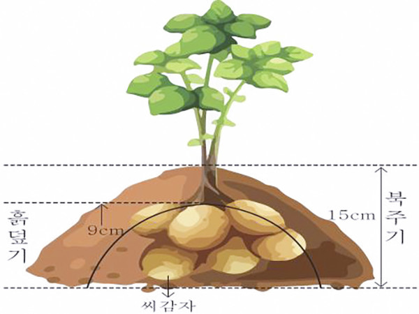 또한 감자를 심을 때는 씨감자의 절단면이 아래쪽으로 가게 하여 싹이 빨리 나오도록 해주고, 감자를 심는 깊이는 호미를 이용하여 10~15㎝ 정도로 해줍니다.