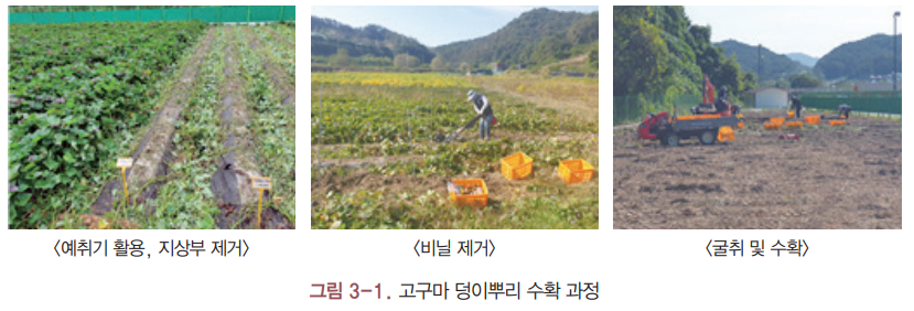 ▶ 비가 온 후 바로 수확하지 말고 수일이 지난 후, 토양이 습하지 않은 맑은 날에 덩굴을 제거하고 비닐을 걷어 낸 다음, 굴취 수확할 것. 고구마 껍질에 상처가 나지 않도록 주의해야 함.