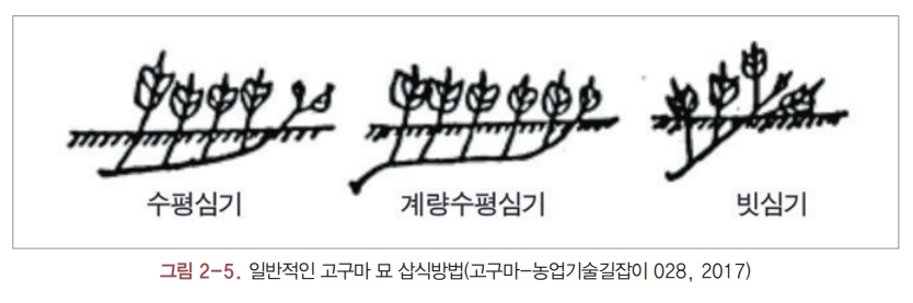 고구마 묘를 심는 방법은 묘의 소질이나 토양수분과 성질에 따라 수평심기, 휘어심기, 곧추심기 등 여러 방법이 있으며 가장 일반적으로 사용되고 있는 것은 수평심기 방법입니다.