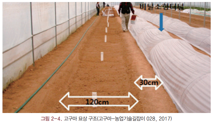 고구마는 육묘한 묘를 잘라 본밭에 심기 때문에 먼저 씨고구마를 심을 묘상을 준비해야 합니다. 본밭 10a에 심을 묘수는 6,000∼7,100개 정도로, 고구마는 한 번 만든 묘상에서 3회 정도 싹을 길러 잘라 심습니다. 1회에 자를 수 있는 싹의 수는 1㎡당 200~240본 정도로 세 차례에 걸쳐 잘라 심을 경우 약 10㎡의 묘상이 있어야 하는데 묘상의 폭은 120㎝~130㎝가 묘상관리와 채묘작업이 수월하며, 길이는 묘상의 면적에 따라 적절하게 정하면 됩니다.
