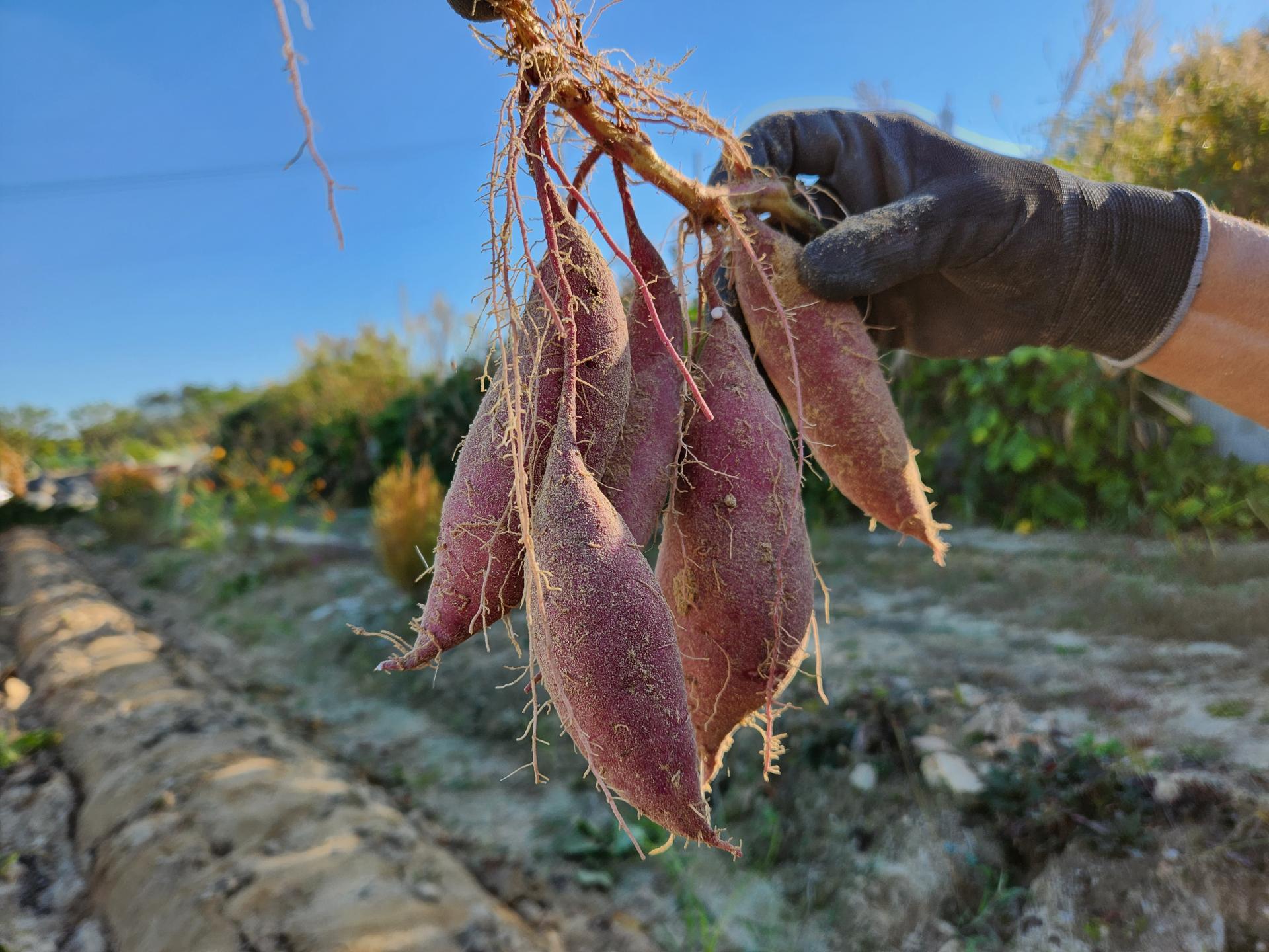 ● 덩굴을 제거하고 호미, 삽, 경운기 등 수확기를 이용하여 고구마에 상처가 나지 않게 캡니다.