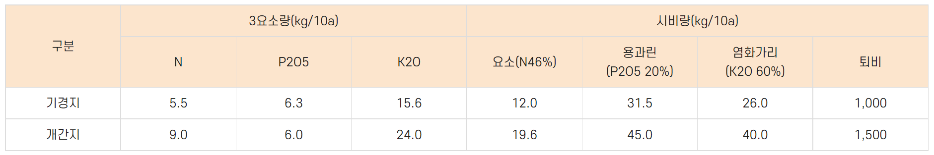 비료는 전량을 밑거름으로 주면 되는데요, 주의할 점은 비료의 유실이 심한 사질토에서는 비료를 몇 회에 걸쳐서 나누어 주는 것이 효과적이라는 것입니다. 이때 질소성분이 많고 가리성분이 적으면 고구마의 지상부만 무성하게 자라고 고구마의 수량이 적을 수 있으니 참고하시기 바랍니다.