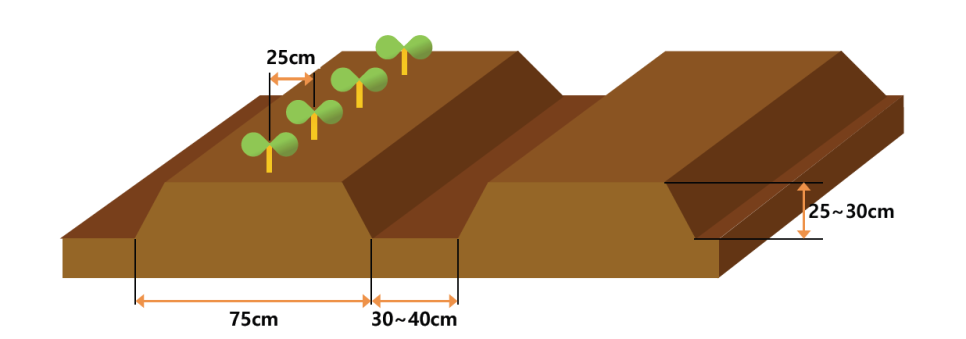 고구마를 심을 이랑을 만들 때는 밑거름을 충분히 준 후에 밭을 갈고 두둑을 만들어 줍니다. 두둑의 넓이는 70~70㎝, 두둑의 높이는 25~30㎝ 정도로 만들어 주면 됩니다.