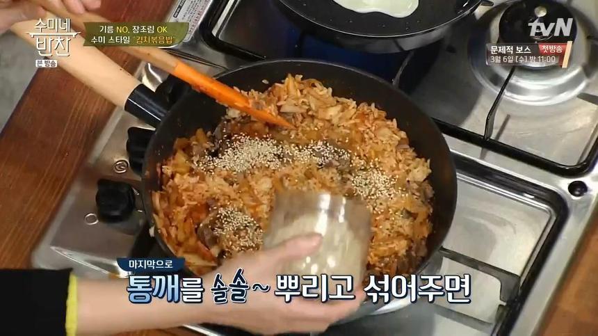 김치볶음밥의 하이라이트, 계란프라이를 올리고 통깨를 뿌려주면 김치볶음밥 맛있게 만드는법 김수미 김치볶음밥 황금레시피가 완성됩니다.