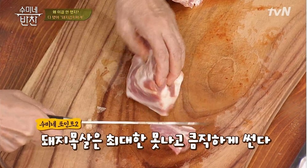 3. 오늘 김치찌개 맛있게 만드는 방법의 포인트는 돼지목살을 최대한 큼직하게 썰어야 한다는 것인데요, 볶지 않고 그대로 넣어주세요.