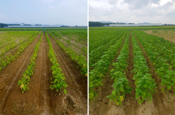 장마시에는 역병이 발생하기 쉬우므로 배수로를 정비하여 물이 잘빠지도록 해주고 장마가 끝난 후 녹병이 발생하면 생육부진으로 수량이 감소하기 때문에 예방을 잘해주어야 합니다.