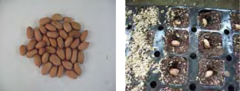 땅콩 끝의 뾰족한 부분을 손끝으로 누르면 쉽게 갈라지는데 씨뿌리기 전에 씨앗용으로 껍질째 보관해 둔 땅콩 열매를 꺼내어 하루 정도 씨를 물에 넣어 불립니다. 모종을 만들 경우에는 50구 플러그 트레이에 1개씩 심으면 됩니다.