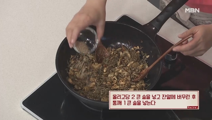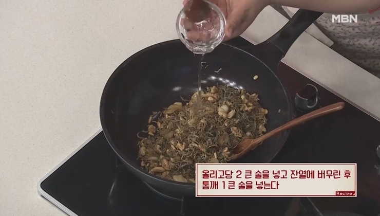 5. 마지막으로 올리고당 2 큰 술을 넣고 잔열로 버무린 후 통깨 1 큰 술을 넣으면 멸치볶음 맛있게 만드는법 이보은 멸치볶음 황금레시피가 완성됩니다.
