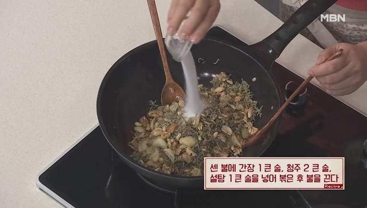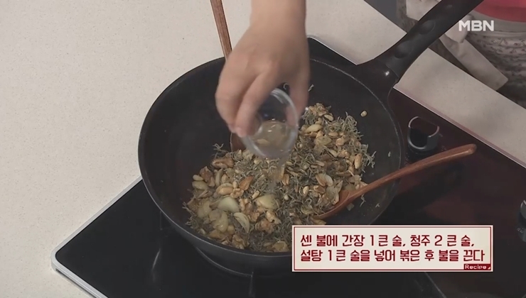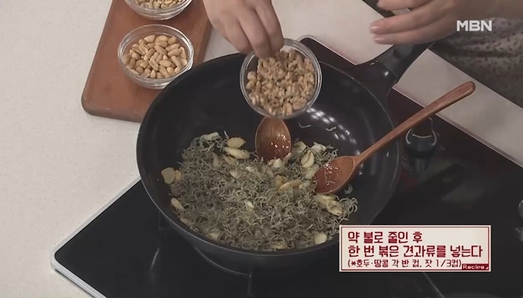 이후 약 불로 줄여 한 번 볶은 견과류를 넣어 주는데요, 이보은 멸치볶음 황금레시피에서는 견과류로 호두·땅콩 각 반 컵, 잣 1/3컵을 넣었어요.