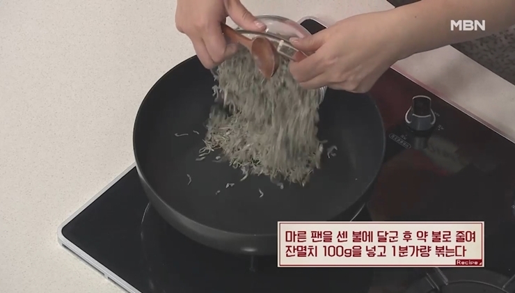 1. 먼저 센 불로 달군 마른 팬을 약 불로 줄인 뒤 잔멸치 100g을 넣고 1분가량 볶아 주세요.