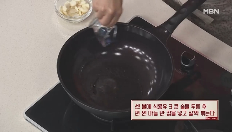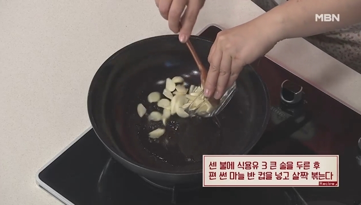 2. 센 불에 식용유 3 큰 술을 두른 후 편으로 썬 마늘 반 컵을 넣고 살짝 볶아 주세요.