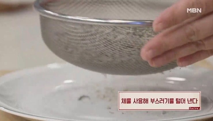 멸치를 다 볶고 나면 체를 이용해 부스러기를 털어냅니다.