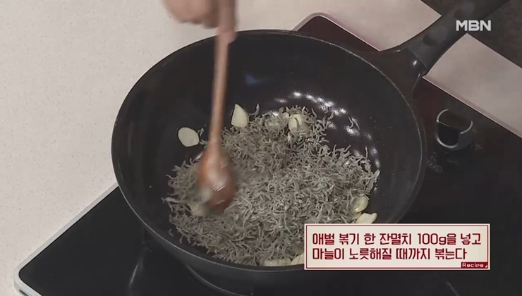 3. 여기에 애벌 볶기한 잔멸치 100g을 넣고 마늘이 노릇해질 때까지 볶아줍니다.