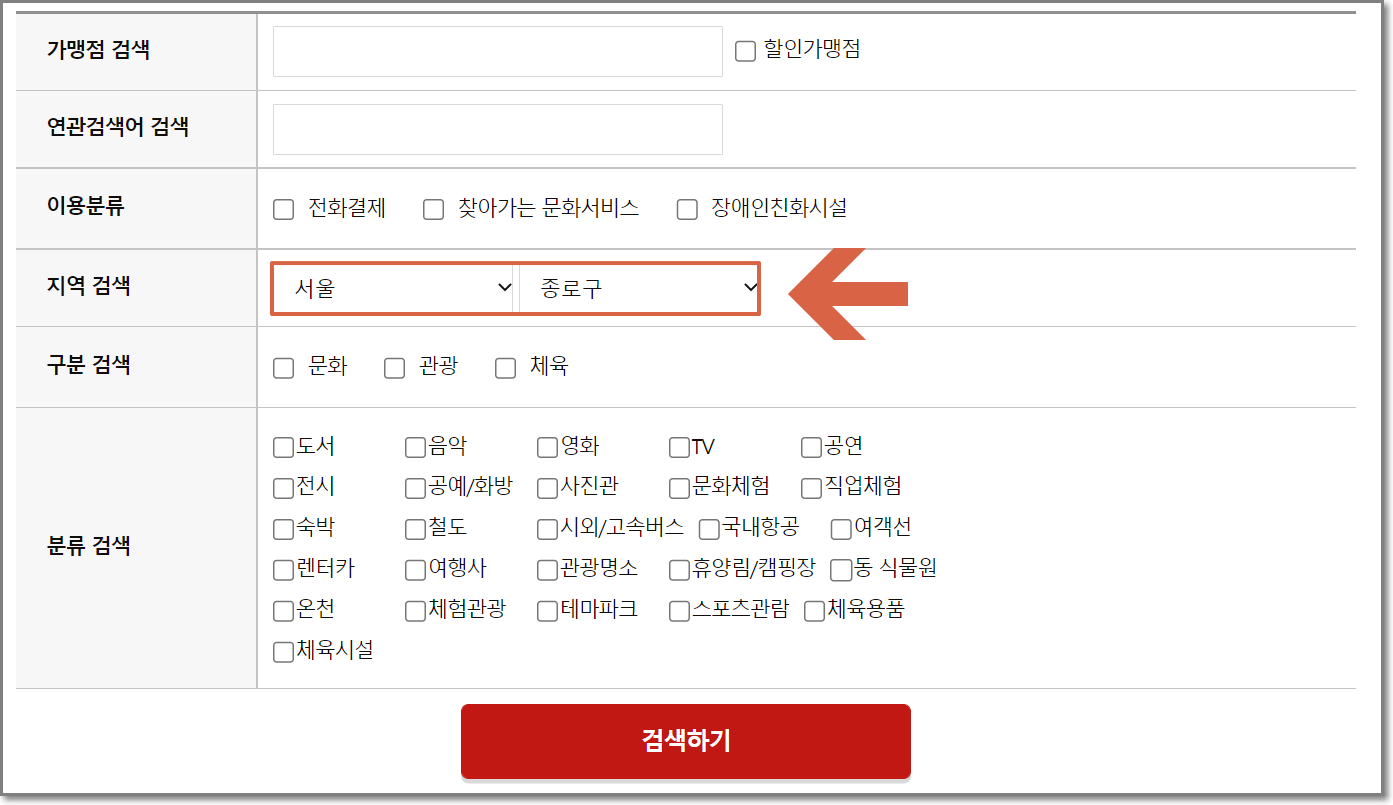 오프라인의 경우 아무래도 본인이 살고 계시는 지역을 기준으로 많이 검색을 하실것 같은데요, 예를 들어 서울시 종로구로 검색을 하면 다음과 같은 문화누리카드 사용처들이 있다는 것을 알 수 있습니다.