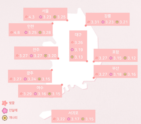 봄꽃 종류 축제 개화시기 총정리 (2023년)입니다. 2023년 벚꽃은 어느 지역에서 가장 먼저 필지 궁금하신 분들 많으시죠? 매년 산림청에서는 우리나라 주요 산림의 ‘2023년 봄꽃 개화 예측지도’를 공개하고 있는데요, 올해 2023년 봄꽃 개화시기 예측지도가 발표되었습니다.
