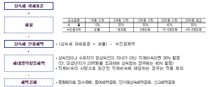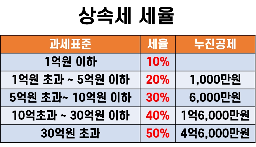 상속세의 경우 세율은 최저 10%부터 최고 50%까지 5단계 초과 누진세율이 적용됩니다.