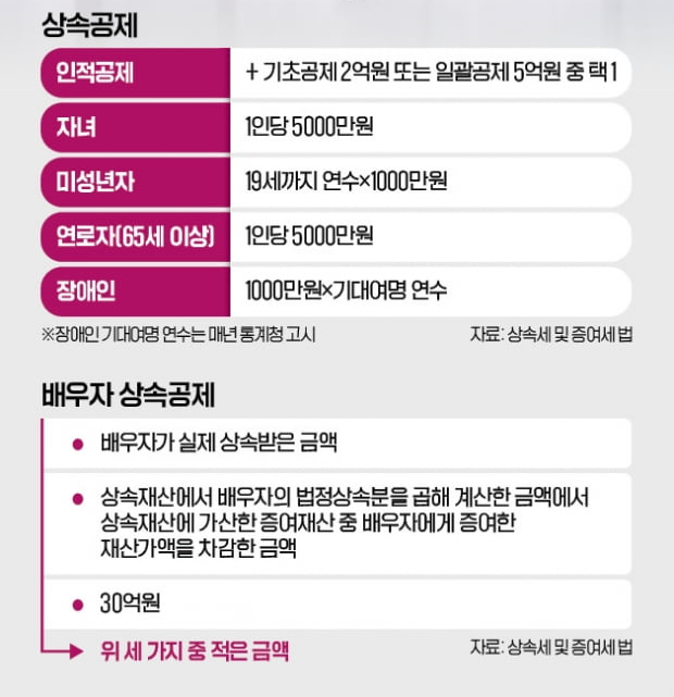 기초공제와 인적공제의 합계액이 5억 미만인 경우 5억이 공제됩니다. 단, 상속인이 피상속인의 배우자만 존재하는 경우 최소 배우자 상속공제 5억 + 기초공제 2억으로 총 7억원의 공제를 받을 수 있습니다. 피상속인의 배우자 외 상속인이 존재하는 경우에는 최소 배우자 상속공제액 5억과 일괄공제 5억으로 총 10억원의 공제를 받을 수 있습니다.