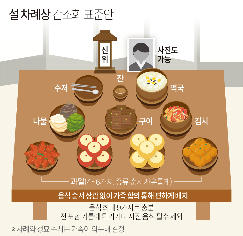 성균관에서 간소화 차례상의 표준안을 내놓았습니다. 간소화된 상차림의 기본 음식은 떡국, 나물, 구이, 김치, 과일, 술 등 6가지만으로도 족하지만 더 올린다면 육류, 생선, 떡 3종을 추가해 9가지면 충분하다고 합니다. 또한 기름에 튀기거나 지진음식을 꼭 올리지 않아도 된다고 하네요.