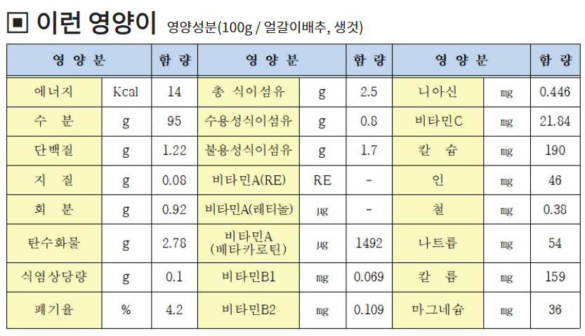 또한 얼갈이 배추는 크기가 커도 식감이 억세지 않아 잎의 크기와 상관없이 다양한 요리에 사용되며, 큰 것은 주로 국거리용, 작은 것은 겉절이나 나물용으로 이용하고 된장과 함께 섭취하면 서로의 부족한 영양소를 보완하여 맛과 영양 모두 좋답니다.
