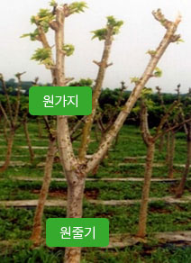 2. 중간만들기 : 나무의 높이가 좀 높아, 가지 밑에 달린 오디는 손으로 수확하고 높이 달린 오디는 밑에 비닐이나 거물망을 깔고 수확해야 하는 번거로움이 있음. 그러나 그루당 수량이 높고 관리법도 비교적 쉬운 좋은 모양