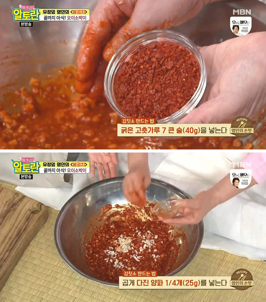 13. 굵은 고춧가루 7 큰 술(40g), 곱게 다진 양파 4분의1개(25g), 송송 썬 부추 반 단(250g)을 넣습니다.