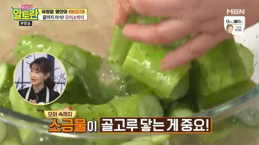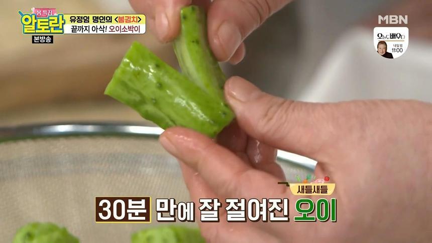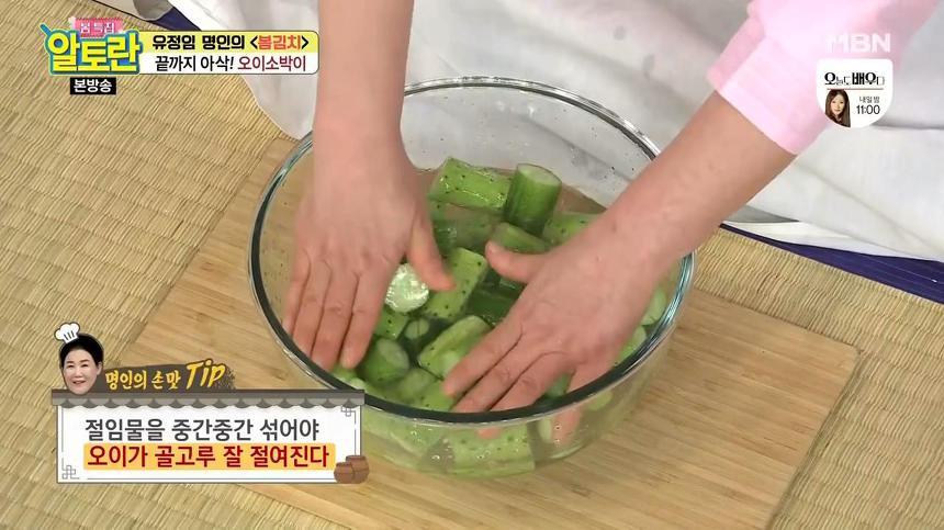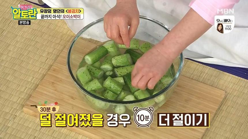 여기서 또 하나 오이소박이 맛있게 담그는법 무르지않게 담는법 황금레시피 비법! 오이를 소금물에 절일 때는 오이 속까지 소금물이 골고루 닿는 것이 포인트예요. 따라서 절임물을 중간중간 섞어주는 것이 좋은데요, 이렇게 해야 오이가 골고루 잘 절여집니다.