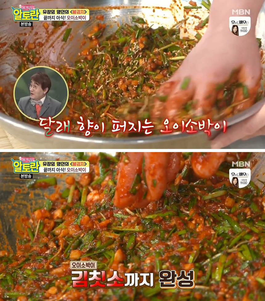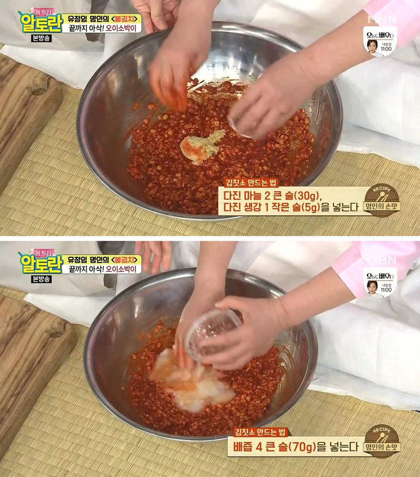 ▶재료 : 자르고 데친 오이 10개 분량, 부추 120g, 양파 22g, 무 400g, 고춧가루 160g, 만능육수 30g, 배즙 70g, 쪽파 2~3뿌리, 매실청 10g, 간마늘 30g, 간생강 5g, 소금 10g, 새우젓 50g