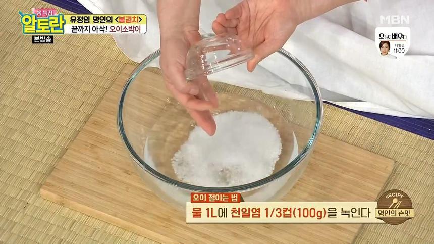 3. 이제 오이를 절일 차례입니다. 먼저 물 1L에 천일염 3분의 1컵(100g)을 녹여줍니다. 참고로 천일염을 녹일때 손으로 휘휘 저어가며 녹여주는 것이 좋다고 해요. 소금이 다 녹았으면 손질한 오이를 넣고 30분간 절여주시면 됩니다.
