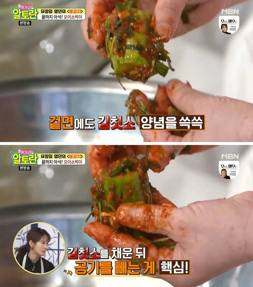 16. 이 때 핵심은 겉면에도 김칫소 양념을 쓱쓱 묻혀주고, 김칫소를 채운 뒤 한번 눌러서 공기를 빼주어야 한다는 것! 이렇게 칼집이 난 부분을 빈틈없이 메꾸어야 김치의 유익균이 잘 자란다고 해요.