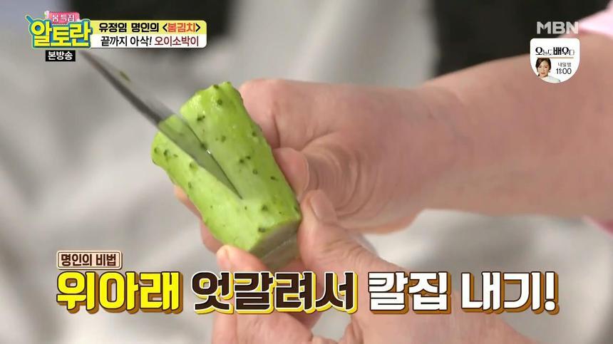 먼저 위에서 한번 칼집을 길게 내주고, 그다음 반대편에서 엇갈리게 칼집을 내주는 것이예요. 오이소박이 맛있게 담그는법 무르지않게 담는법 황금레시피의 또 한가지 비법이라고 볼 수 있는데요, 이는 양념이 양쪽에 고루 배게 하기 위해서라고 해요.