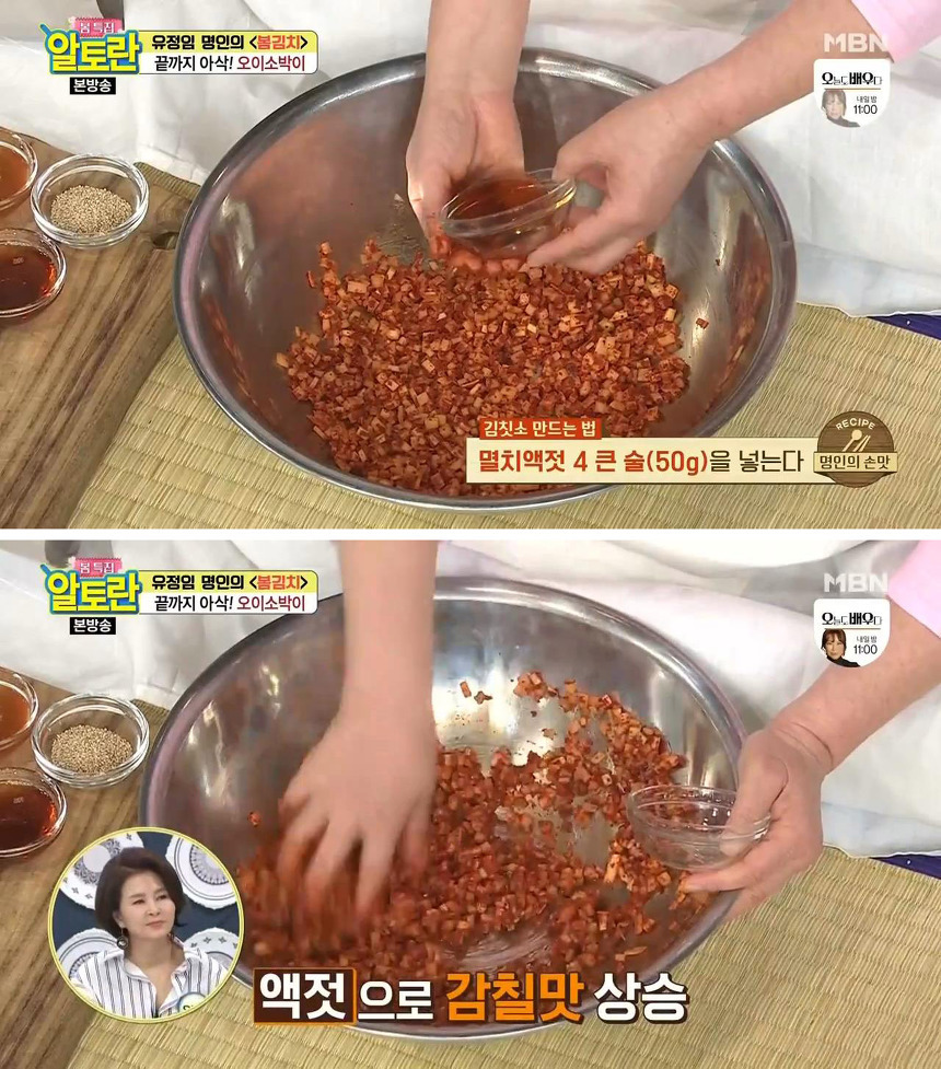 8. 다음으로 멸치 액젓 4 큰술(50g)을 넣어주세요. 멸치액젓이 들어가면 김칫소에 감칠맛이 더해져요.
