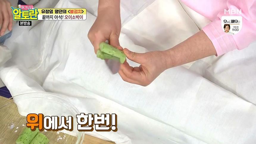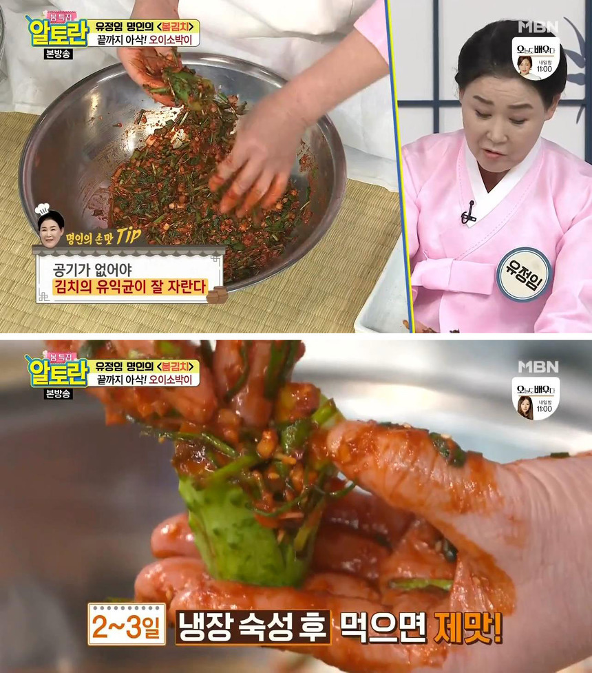 16. 이 때 핵심은 겉면에도 김칫소 양념을 쓱쓱 묻혀주고, 김칫소를 채운 뒤 한번 눌러서 공기를 빼주어야 한다는 것! 이렇게 칼집이 난 부분을 빈틈없이 메꾸어야 김치의 유익균이 잘 자란다고 해요.