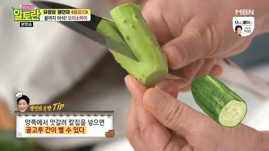 먼저 위에서 한번 칼집을 길게 내주고, 그다음 반대편에서 엇갈리게 칼집을 내주는 것이예요. 오이소박이 맛있게 담그는법 무르지않게 담는법 황금레시피의 또 한가지 비법이라고 볼 수 있는데요, 이는 양념이 양쪽에 고루 배게 하기 위해서라고 해요.