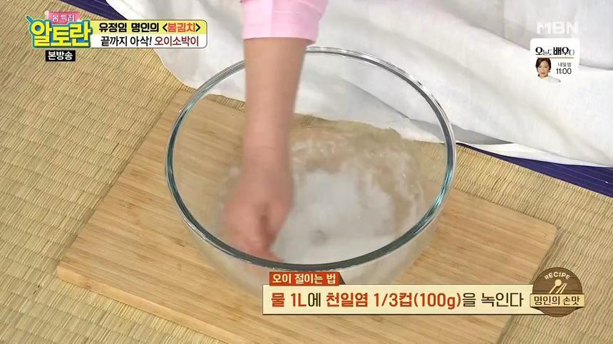 여기서 또 하나 오이소박이 맛있게 담그는법 무르지않게 담는법 황금레시피 비법! 오이를 소금물에 절일 때는 오이 속까지 소금물이 골고루 닿는 것이 포인트예요. 따라서 절임물을 중간중간 섞어주는 것이 좋은데요, 이렇게 해야 오이가 골고루 잘 절여집니다.