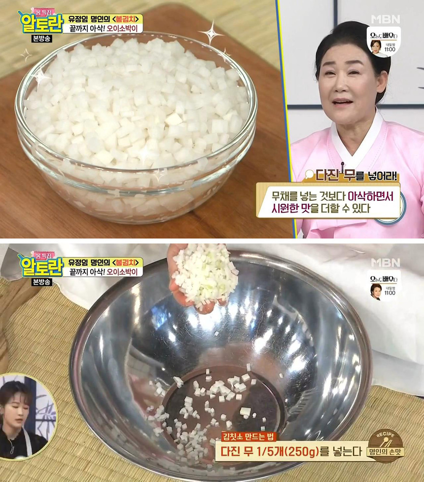 6. 이제 김칫소를 만들 차례예요. 먼저 다진 무를 준비해야 하는데요, 보통 오이소박이는 무를 채 썰어서 넣으시죠? 하지만 오늘 알려드리는 오이소박이 맛있게 담그는법 무르지않게 담는법 황금레시피에서는 오이소박이에 무를 다져서 넣는답니다. 이렇게 하면 무채를 넣는 것보다 아삭하면서 시원한 맛을 더할 수 있기 때문이라고 해요.