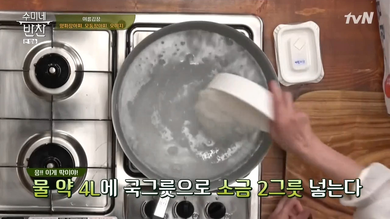 3. 오이지 담글 소금물을 펄펄끓여 준비해야 하는데요, 물 약 4L에 국그릇으로 소금 2그릇을 넣고 끓이면 됩니다. 수미쌤은 오이지가 싱거운 것보다는 차라리 짠 게 더 좋다고 하시네요. 오이지가 싱거우면 빨리 부패할 수 있기 때문이라고 해요.