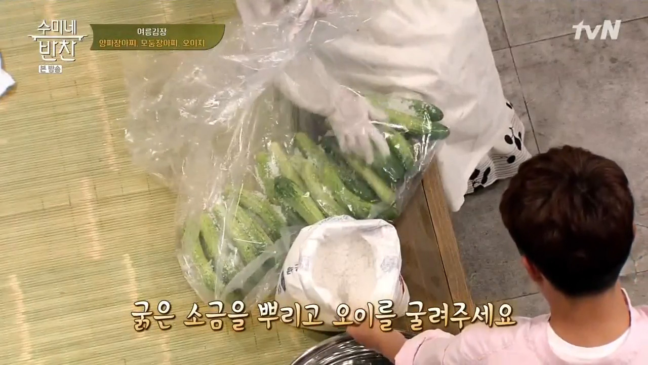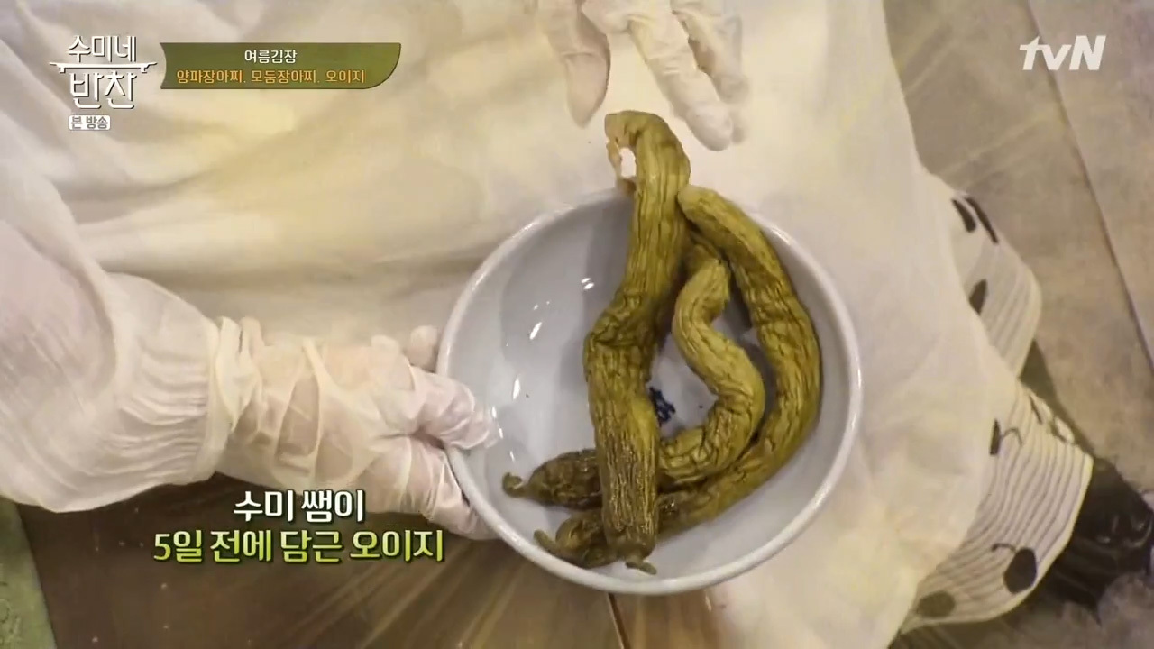 시간이 지나면 오이에서 물이 나오기 때문에 보관할 때는 고르게 절여지도록 오이를 뒤집어 주면서 보관하는 것이 좋아요. 수미쌤이 5일전에 담근 오이지를 가지고 오셨는데요, 시원한 얼음물에 잘 익은 오이지와 통깨, 고추를 넣으면 맛있는 오이지가 완성돼요.