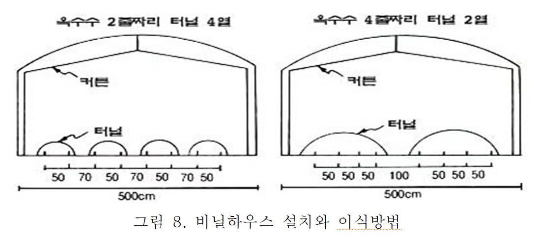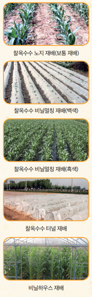 비가림재배는 옥수수 파종시기가 장마기에 해당되며, 대형비닐하우스 안에서 온도가 높고 습기가 많은 시기에 재배되므로 배수구 설치 및 병충해 방제에 주의 하여야 합니다. 일반적으로 찰옥수수를 재배하는 것이 수량성이나 소득면에서 유리합니다.