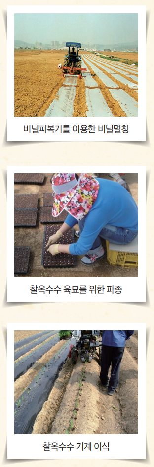 보통 직파재배 보다 5~10일 빨리 수확할 수 있으며 옥수수 파종시기는 일반적으로 4월상순이나 지역에 따라서 너무 일찍 파종하면 서리의 피해를 받을 수 있고, 반면에 5월 이후에 너무 늦게 파종하면 비닐멀칭의 효과가 적음