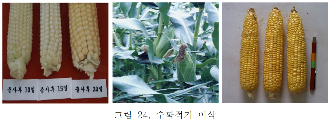 옥수수 속을 까 보면 알 속에 풀이나 치즈와 같이 된 내용물이 많고, 품종고유의 색을 띄고 있으면 수확기가 된 것입니다. 만일 내용물이 아직도 젖 상태이면 아직 이르고, 완전히 굳어져 있으면 과숙된 경우입니다.