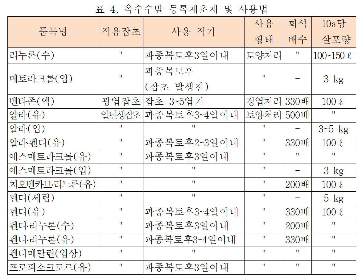 ▶ 옥수수 파종 후 3~4일 이내에 제초제를 반드시 뿌려 옥수수가 잡초와 경합하지 않도록 해야함
